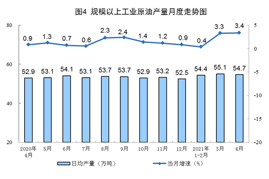 ? ? ? ?原油生產(chǎn)平穩(wěn),加工量保持增長(zhǎng)。4月份,生產(chǎn)原油1641萬(wàn)噸,同比增長(zhǎng)3.4%,比2019年4月份增長(zhǎng)4.3%,兩年平均增長(zhǎng)2.1%,日均產(chǎn)量54.7萬(wàn)噸。加工原油5790萬(wàn)噸,同比增長(zhǎng)7.5%,比2019年4月份增長(zhǎng)8.3%,兩年平均增長(zhǎng)4.1%,日均加工193.0萬(wàn)噸。
