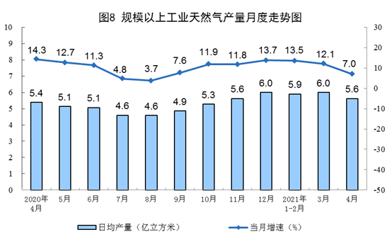 1-4月份,生產(chǎn)天然氣702億立方米,同比增長(zhǎng)11.6%,比2019年1-4月份增長(zhǎng)23.1%,兩年平均增長(zhǎng)10.9%。
