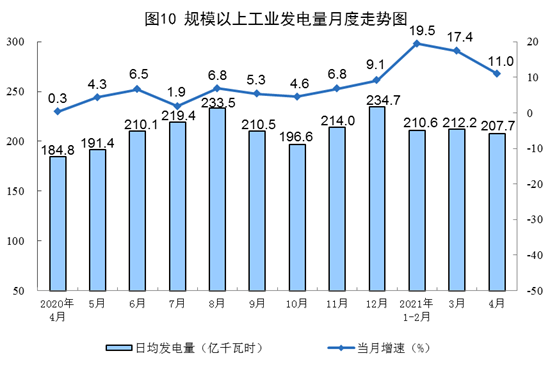 ? ? ? ?電力生產(chǎn)較快增長(zhǎng)。4月份,發(fā)電6230億千瓦時(shí),同比增長(zhǎng)11.0%,比2019年4月份增長(zhǎng)11.3%,兩年平均增長(zhǎng)5.5%,日均發(fā)電207.7億千瓦時(shí)。1-4月份,發(fā)電25276億千瓦時(shí),同比增長(zhǎng)16.8%,比2019年1-4月份增長(zhǎng)10.9%,兩年平均增長(zhǎng)5.3%。